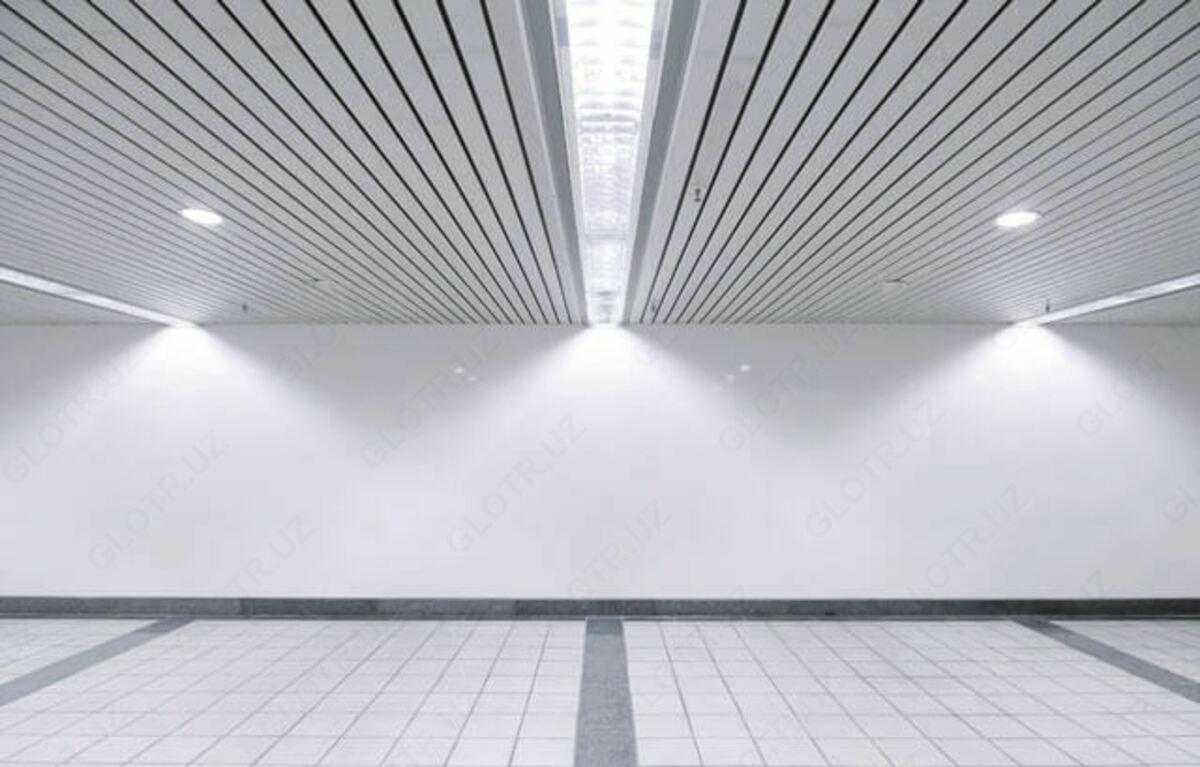 Реечный потолок представляет собой подвесной каркас, на котором закреплены узкие металлические панели. Для фиксации каркаса на потолке используются специальные подвесы, располагающиеся на определенном расстоянии.